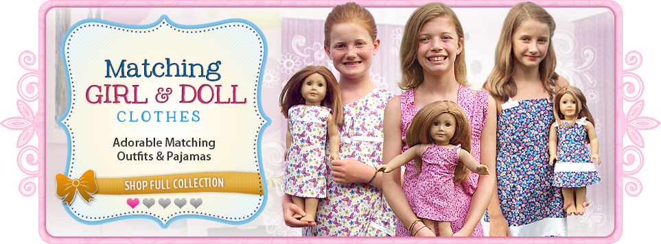 Doll Clothes Superstore was established by a Kindergarten teacher whose mission was to provide excellent quality, handmade doll clothes in a variety of styles at affordable prices for all sizes and types of dolls. That vision remains our goal still today as a labor of love as we strive to make the best handmade clothes for dolls available. We make custom doll clothes for all the popular dolls sold in the past as well as new hot dolls as they appear on the market. We recognize people have dolls from their childhood that need new clothing and that new favorite dolls appear each year. Sure to make your favorite girl smile are our matching girl and doll clothes online. We have a large selection of matching girl and doll dresses, pants, shorts and sleepwear. We also have doll shoes and accessories. Our custom doll clothes are our own designs.