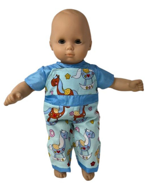 - Overalls for baby dolls featuring an adorable rocking horse print.