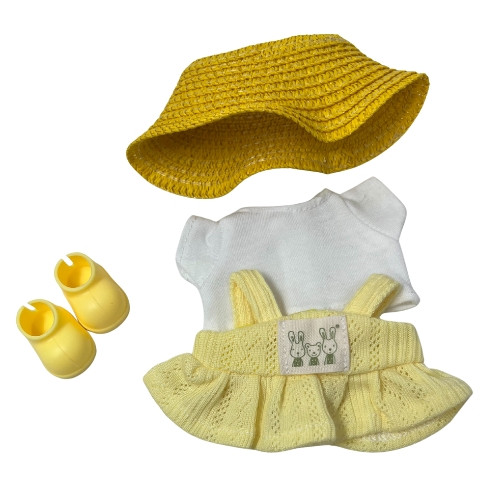 To complete the look, the set includes a matching yellow straw hat for a warm-weather vibe and a pair of coordinating yellow shoes, adding the perfect finishing touch. Whether styled for a sunny day scene or added to a growing Labubu collection, this outfit brings brightness and personality to any display.